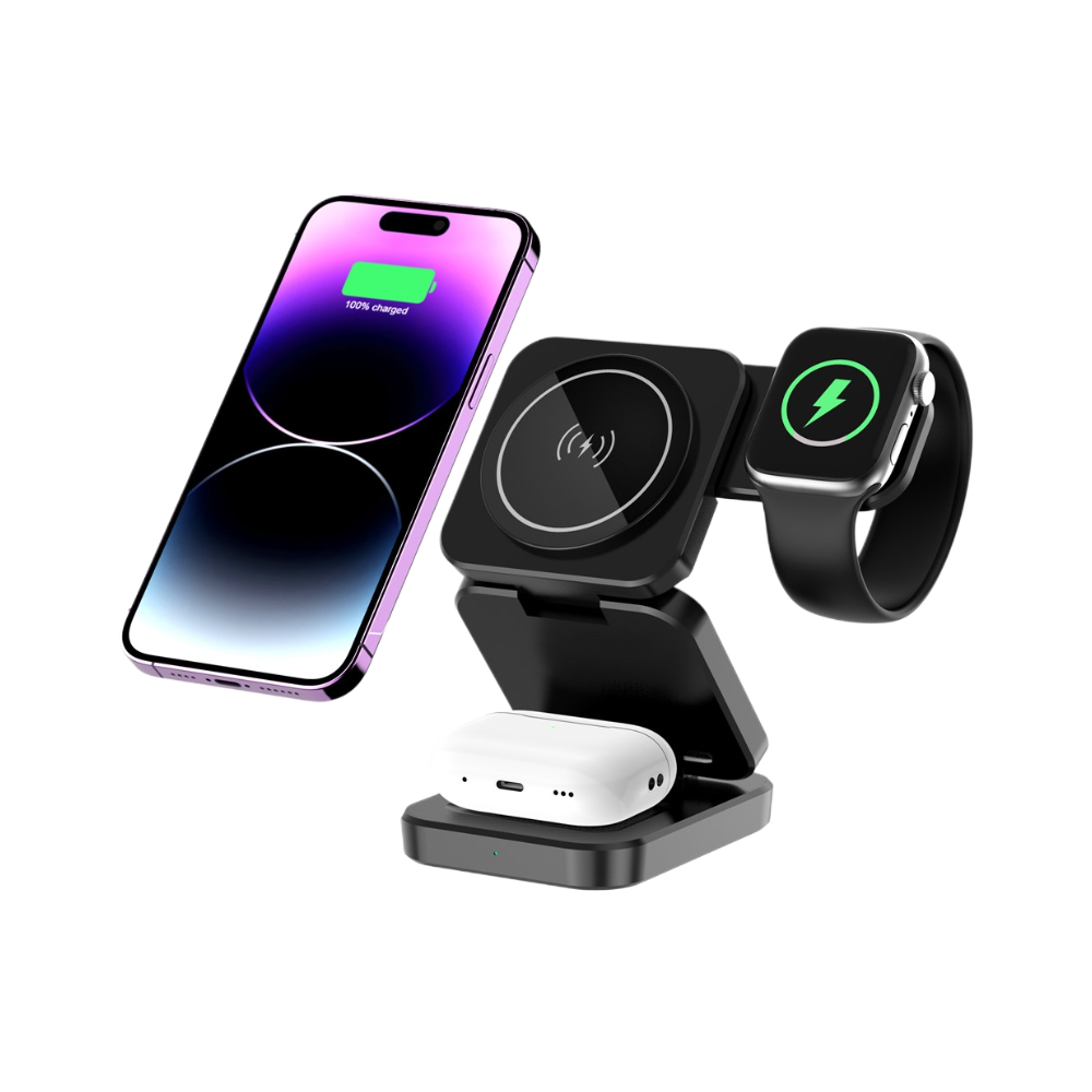 A lightweight, fully foldable 3-in-1 magnetic charger that you can slip into any bag, making it easy to keep your essential devices powered wherever you are.