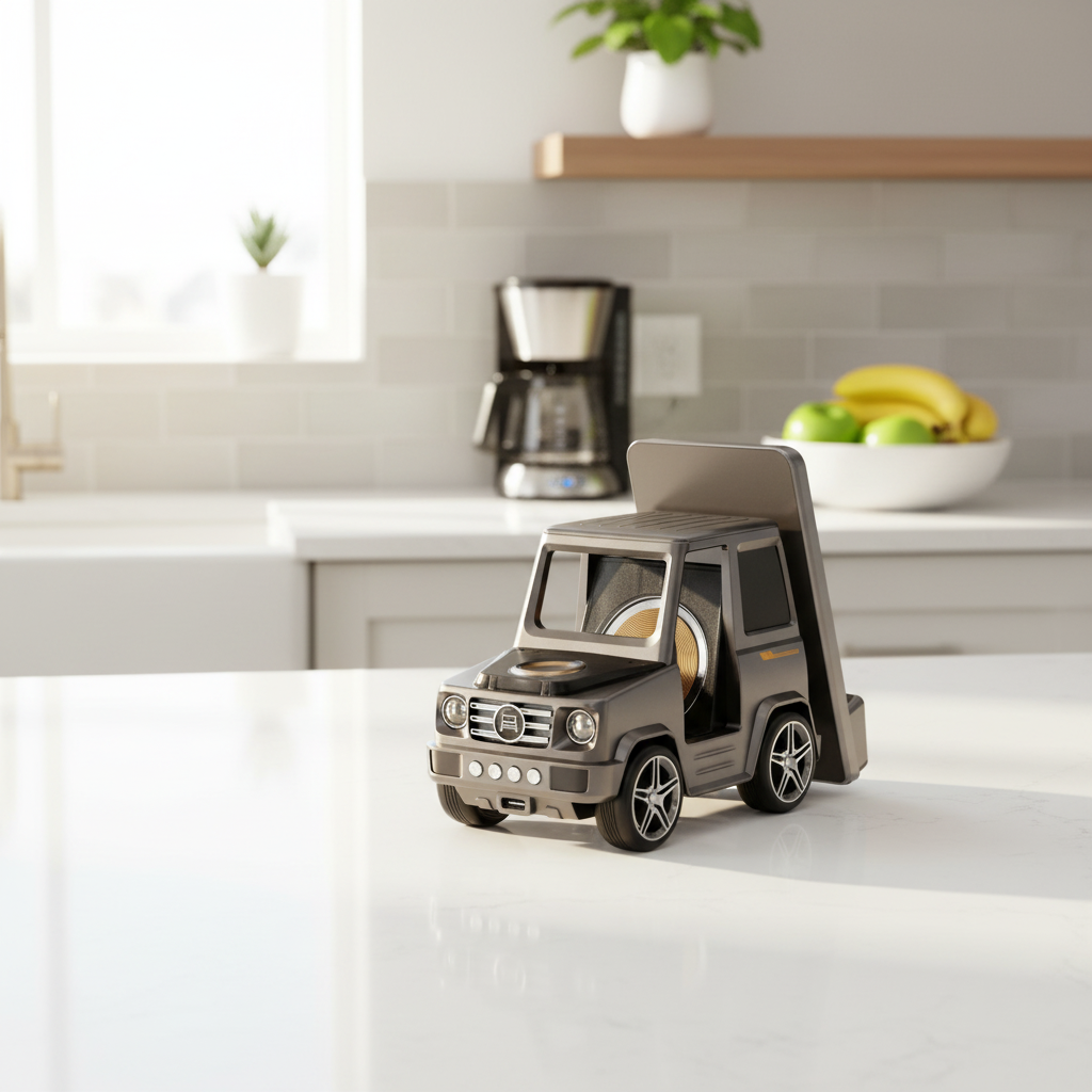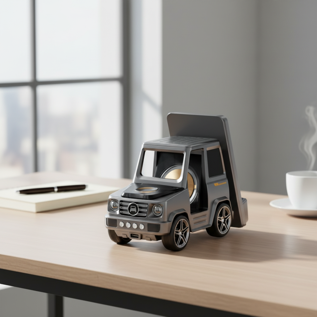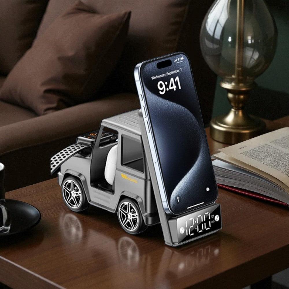 A versatile 5-in-1 wireless charging station designed with a sleek, automotive-inspired look, combining multiple charging functions into one device that brings both practicality and a modern touch to any setup.
