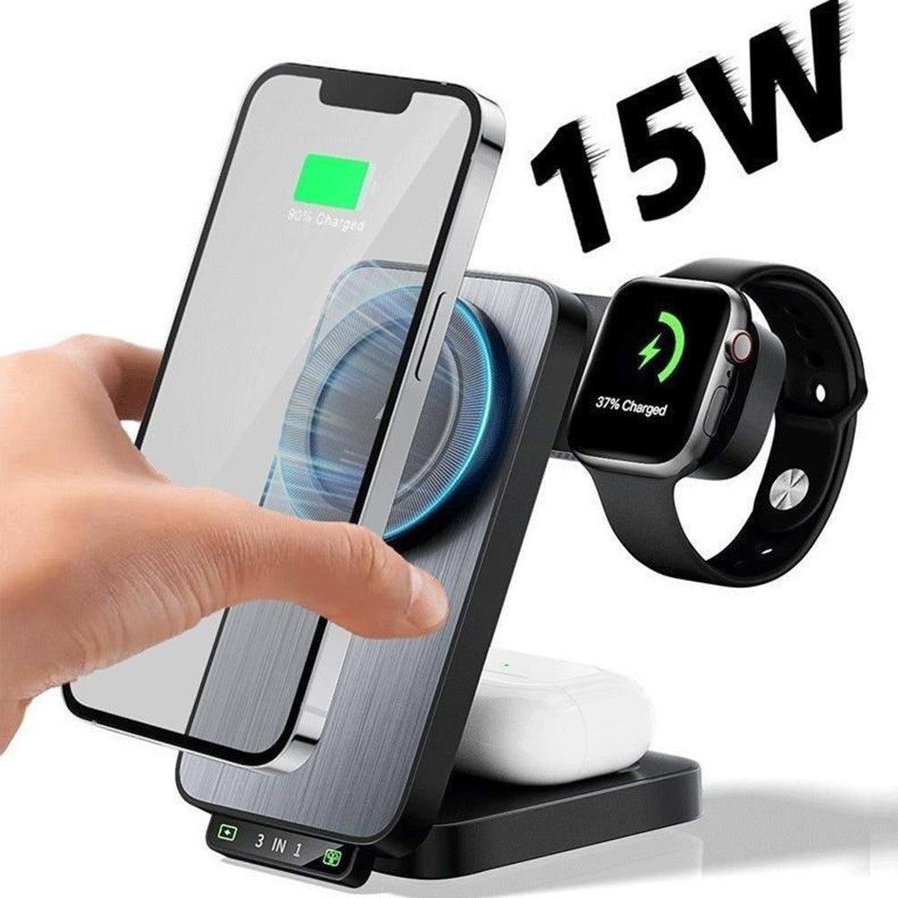 A practical 3-in-1 charging hub that brings your phone, earbuds, and Apple Watch together in one small, streamlined station, making it easy to keep all your essentials powered without taking up much space.