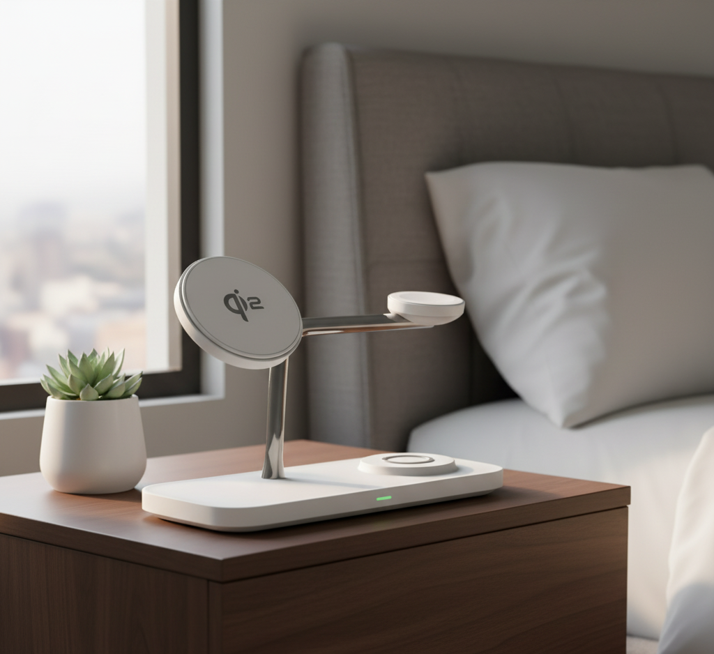 A certified Qi2 3-in-1 charging station designed to power your phone, smartwatch, and earbuds all in one place, offering a clean and efficient setup for everyday use.