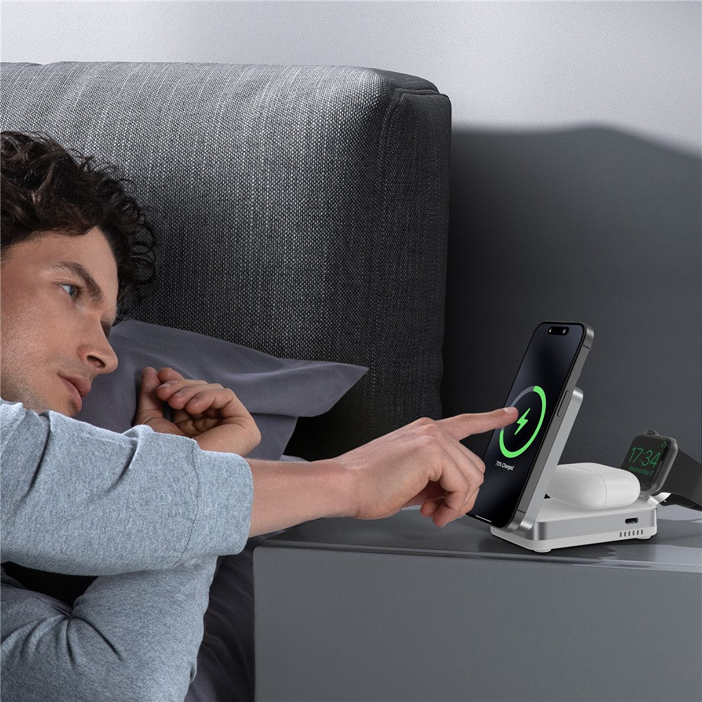 - Qi2-certified 3-in-1 magnetic wireless charging station for iPhone, Apple Watch, and earbuds.